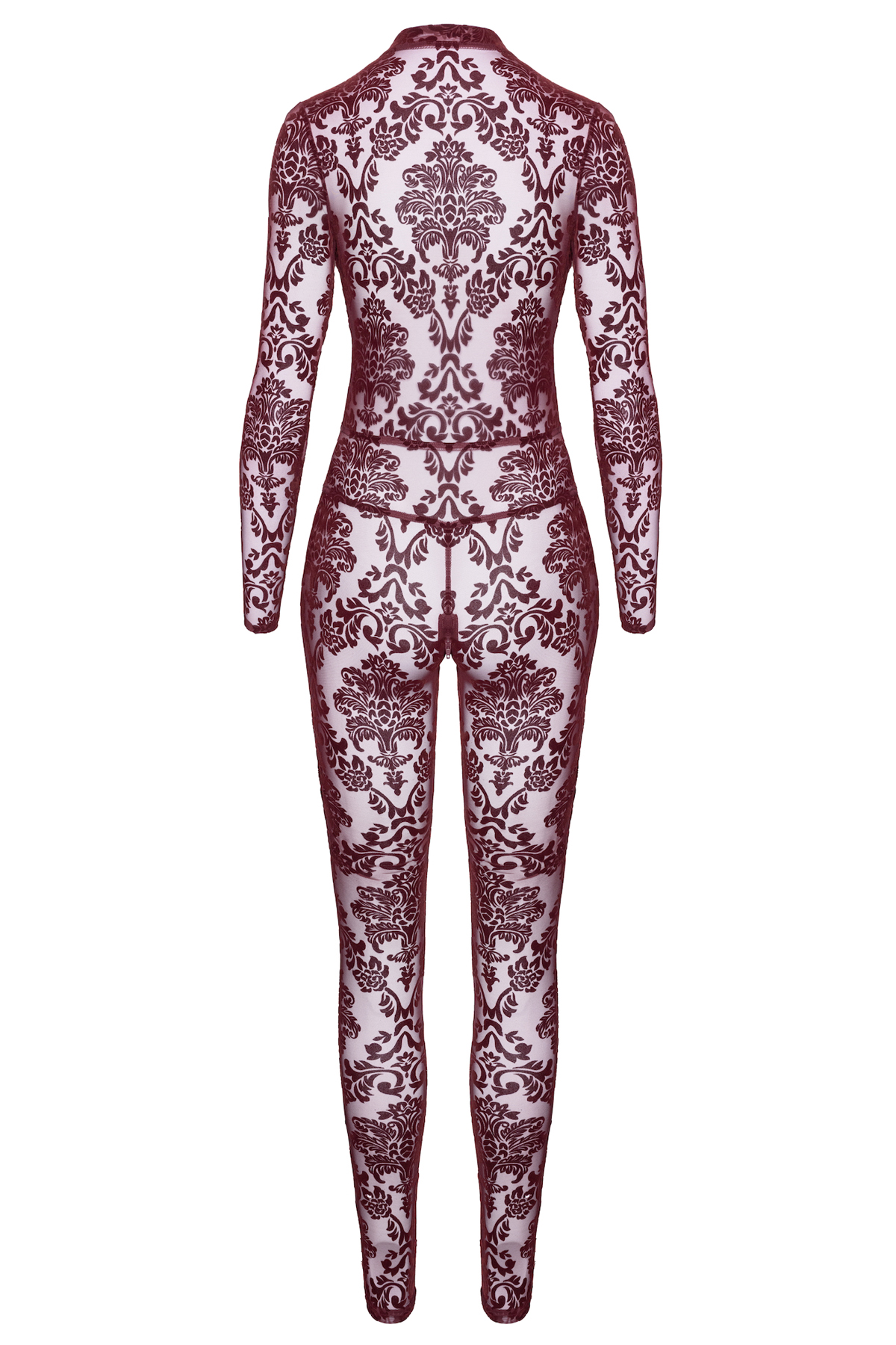 In diesem verführerischen Jumpsuit aus luxuriösem burgunderfarbenem Flocktüll fallen Sie garantiert auf. Der tiefe Ausschnitt betont Ihr Dekolleté, während die langen Ärmel und die langen Beine eine schlanke, gestreckte Silhouette zaubern. Das Design ist elegant und verführerisch zugleich und wird durch einen dezenten Reißverschluss im Schritt abgerundet, der Funktionalität mit ausdrucksstarker Sinnlichkeit verbindet. Perfekt für unvergessliche Nächte, in denen Selbstbewusstsein Ihr wichtigstes Accessoire ist.