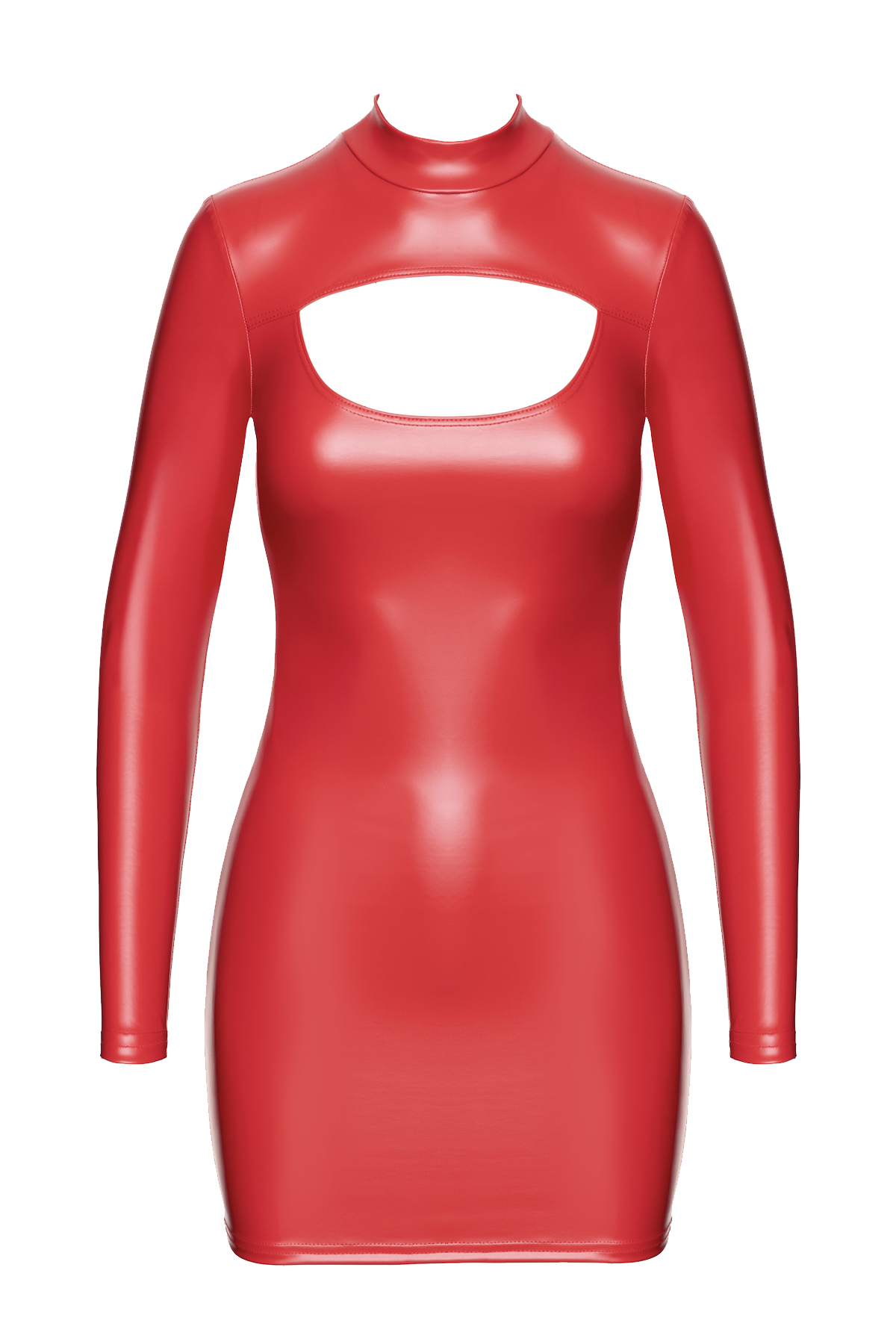 Dieses figurbetonte rote Powerwetlook-Minikleid präsentiert sich elegant und kantig. Der markante Schlüsselloch-Ausschnitt betont die Brust, ergänzt durch lange Ärmel und einen raffinierten Stehkragen. Der verdeckte Reißverschluss am Rücken sorgt für eine nahtlose, perfekte Passform - ideal, um jeden Moment zum Statement zu machen.