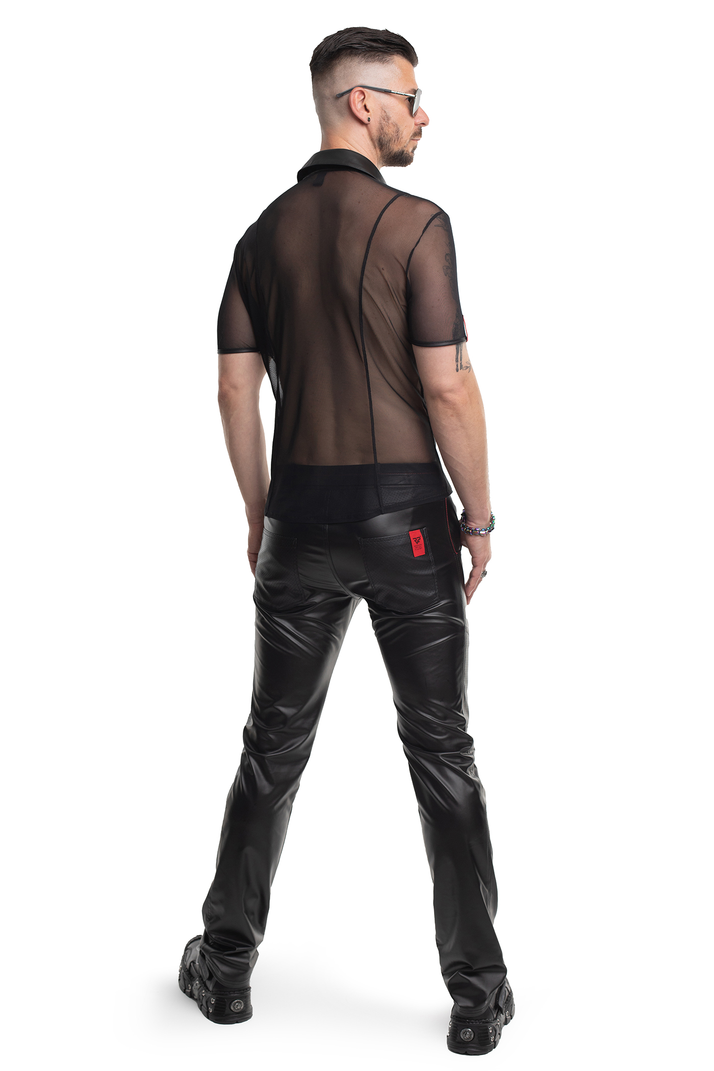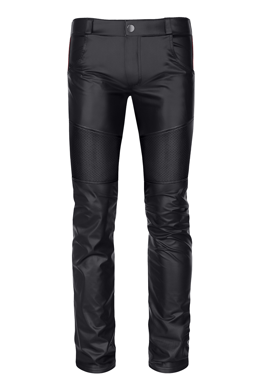 Klassische Low-Waist-Hose aus elastischem schwarzem Wetlook-Stoff. Vorne an den Oberschenkeln befinden sich Einsätze aus perforiertem Material, die die Blicke auf sich ziehen und als attraktives optisches Detail dienen. Die Hose verfügt über zwei Vorder- und zwei Gesäßtaschen, die ausreichend Platz für Handy, Geldbörse, Autoschlüssel oder andere kleine Gegenstände bieten. Die Reißverschlüsse sind mit dem RFP Regnes Fetish Planet-Logo graviert. Die Hose ist mit Gürtelschlaufen ausgestattet, sodass sie mit einem Gürtel getragen werden kann. Ein markantes rotes Alcantara-Etikett mit dem RFP-Logo rundet die Hose perfekt ab - ein Detail, das jeden begeistert, der Wert auf raffinierte und einzigartige Designelemente legt.
