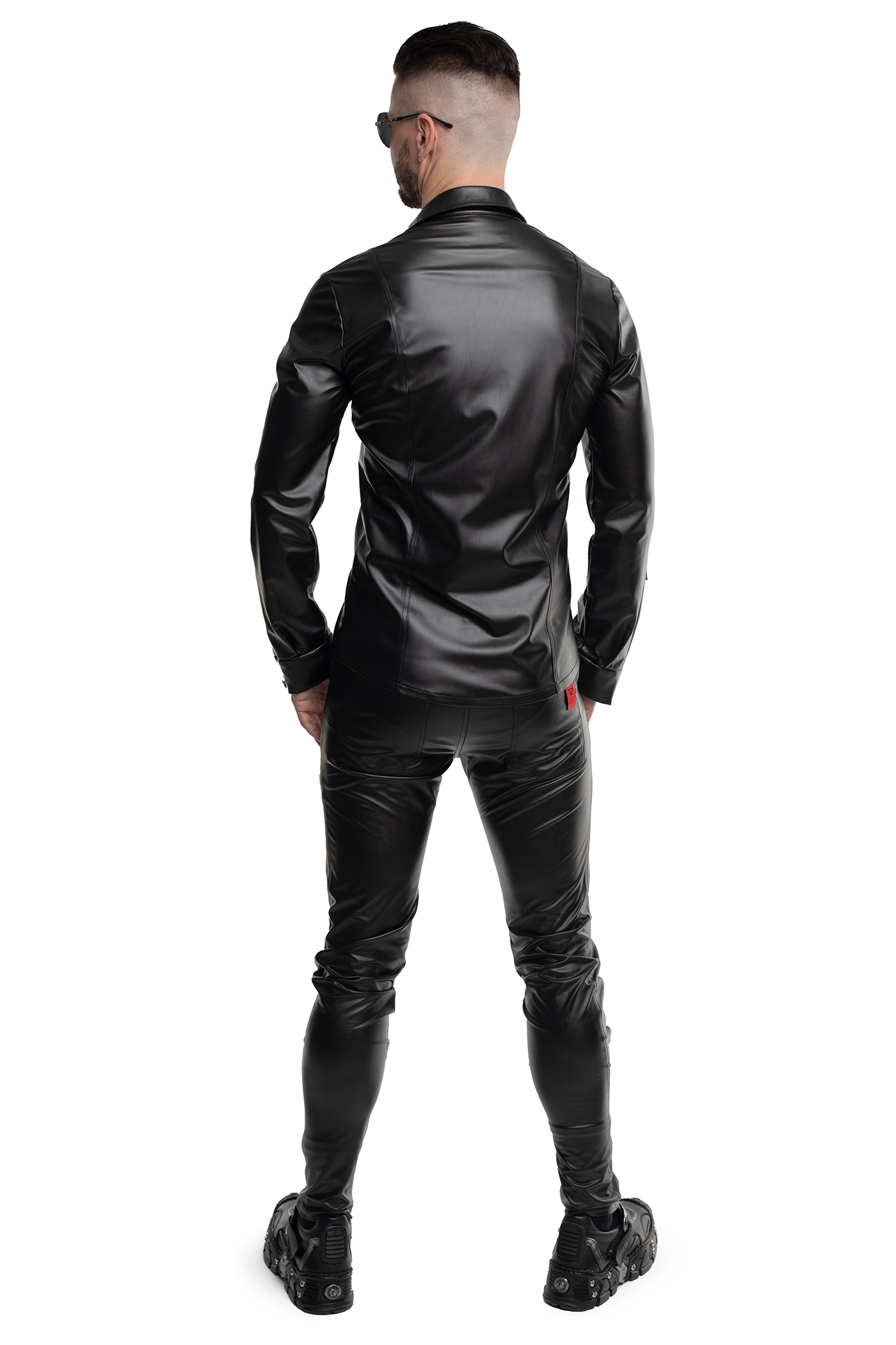 Schwarzes Shirt aus elastischem Wetlook-Material. Die Vorderseite verfügt über zwei praktische Taschen und einen vertikalen Reißverschluss, der sich sowohl von oben als auch von unten öffnen lässt. Die Reißverschlüsse sind mit unserem Markenlogo RFP graviert. Der schwarze Kragen setzt einen eleganten Akzent, während die Ärmel mit dekorativen silbernen Druckknöpfen befestigt werden. Sowohl auf der Rückseite als auch auf der Vorderseite bilden vier vertikale Nähte ein Designdetail, das die Silhouette optisch schlanker wirken lässt. Unten befindet sich ein markantes rotes Alcantara-Label mit dem lasergravierten RFP-Logo. Das Shirt sieht toll aus in Kombination mit der Hose RMGabriele001 – wie auf den Fotos zu sehen.